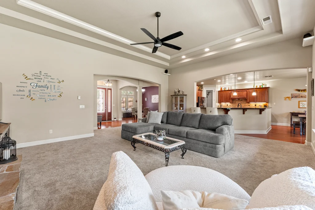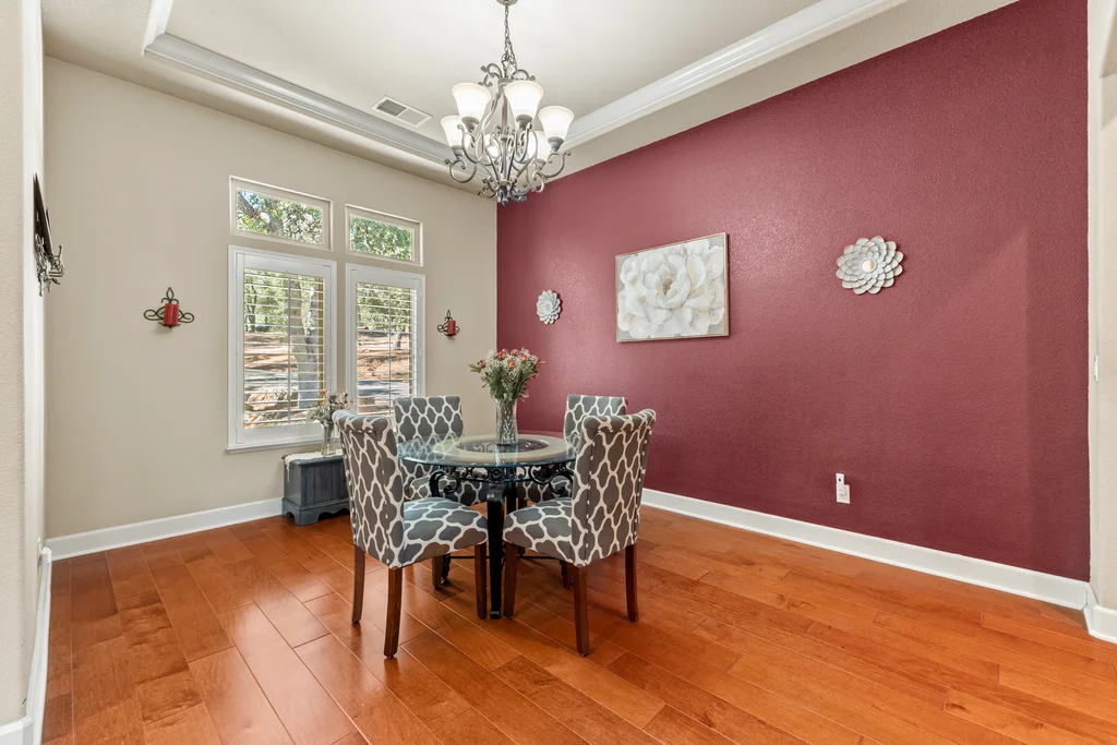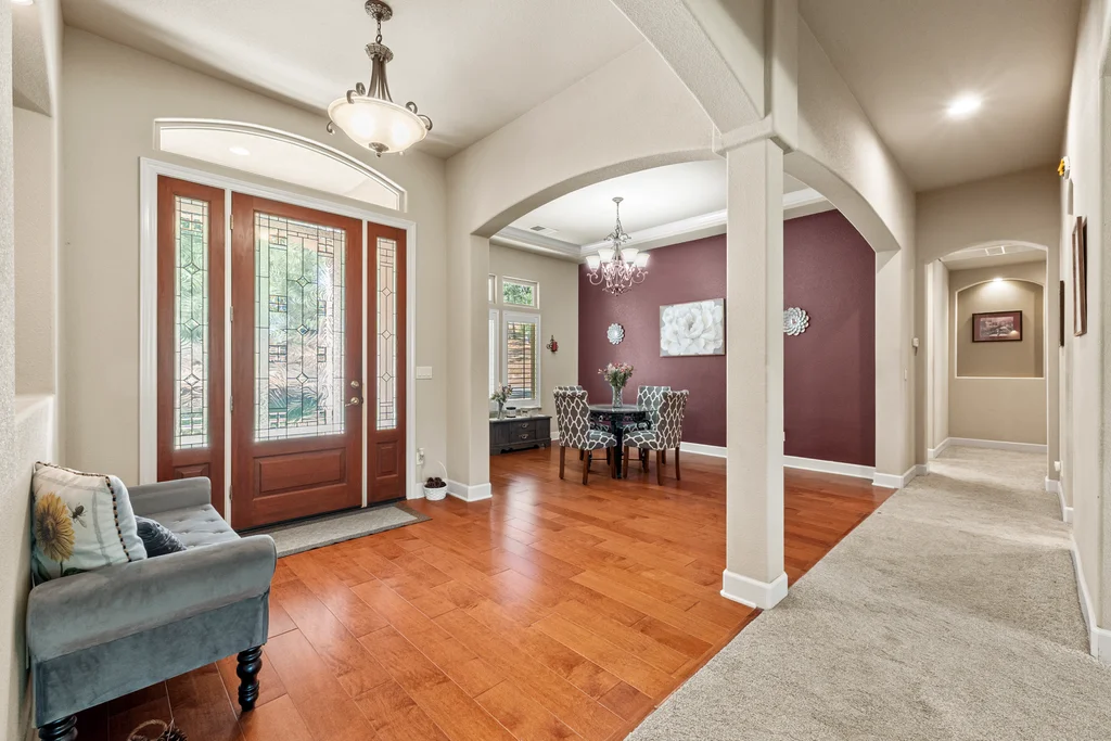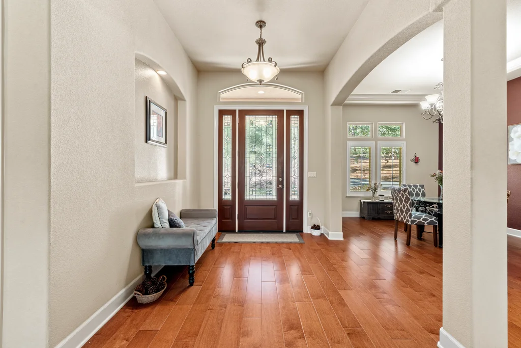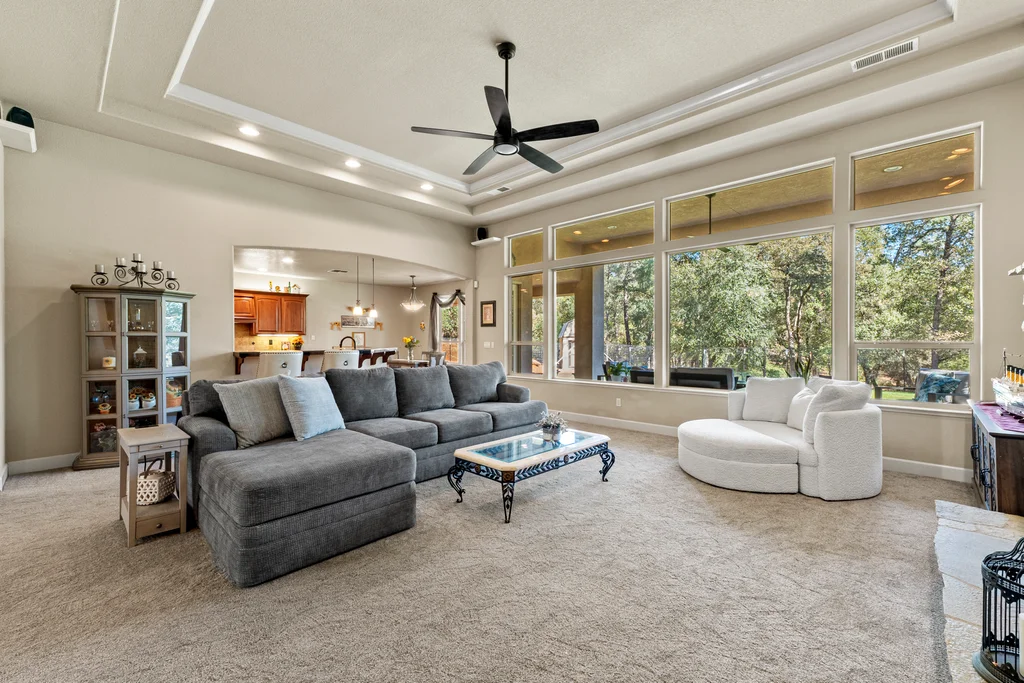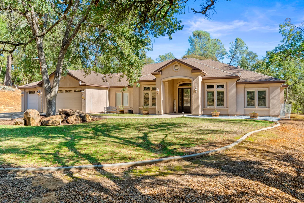 Gorgeous single-story home on five private and usable acres! Ideally located just minutes from Hwy 50, shopping, and local amenities.Step inside to an open and inviting floor plan filled with natural light. Soaring 12-foot ceilings, new carpet and beautiful engineered hardwood floors flow through the entry, kitchen, and dining areas. The spacious great room features large picture windows, a cozy fireplace with stone accents, while the sizable kitchen offers granite tile countertops, a gas cooktop, built-in oven and microwave, breakfast nook, dining bar, and walk-in pantry. The primary suite is a dream, with outside access and a luxurious bath featuring a soaking tub, dual sinks, walk-in shower with dual shower heads, tile finishes, and both a walk-in and secondary closet. The additional 3 bedrooms are generously sized, with one offering the flexibility to serve as an office or den. A full hall bath and a convenient half bath for guests complete the layout. The laundry room with sink and storage cabinets leads to the large three-car garage. The front and back yards are beautifully maintained, while the rest of the acreage offers endless potential space for a pool, animals, gardens, or future buildings. Relax on the large covered back patio and soak in the private wooded views.